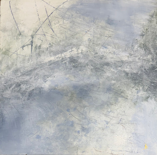 This abstract winter-inspired painting captures a serene, ethereal landscape filled with soft, whispering hues of...