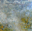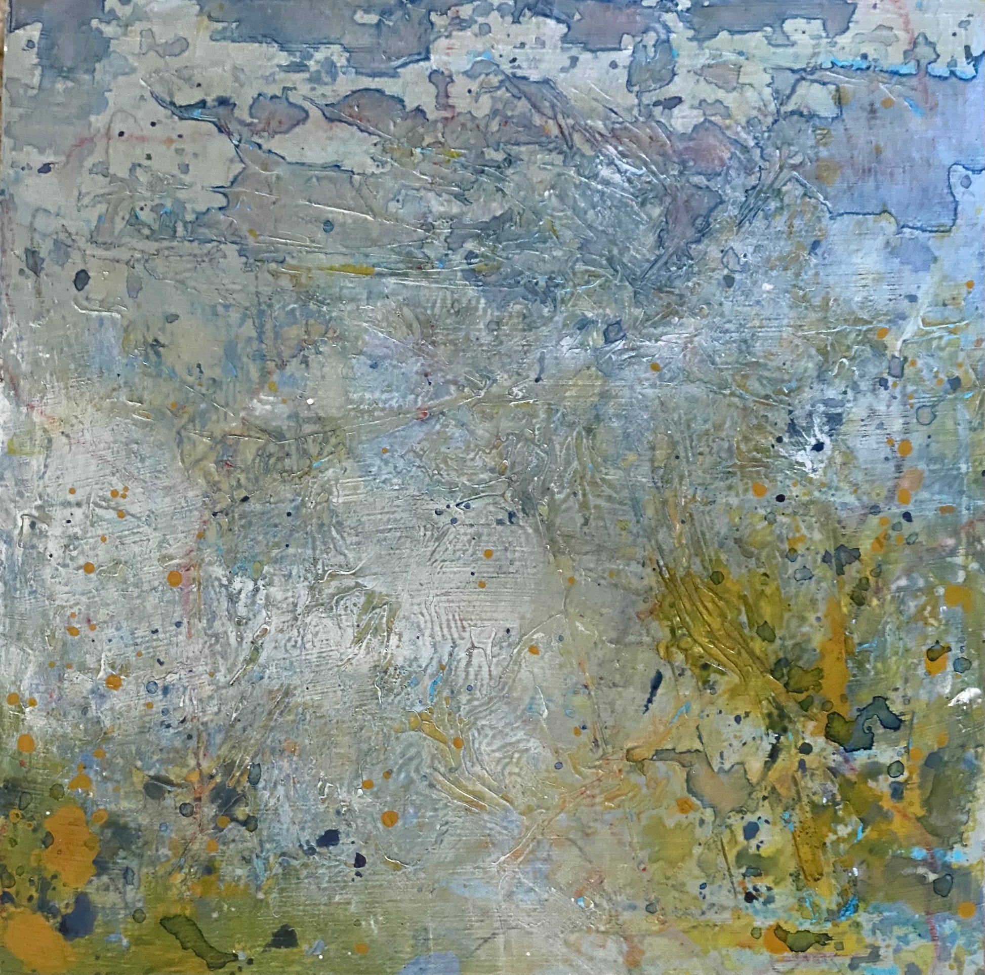 In the close-up, this painting reminds me of an intriguing sky with whitewater rapids of a river flowing below and yellow flora on its banks. I find myself staring and pondering the amazing variations of color and texture in the sky. It's like the sun is beginning to set with a slight amount of red and orange creating a mixture of purple in the blue sky. I marvel at the magic of paint surprises like serendipitous events that occur in life. It seems to give me pause for an instant.