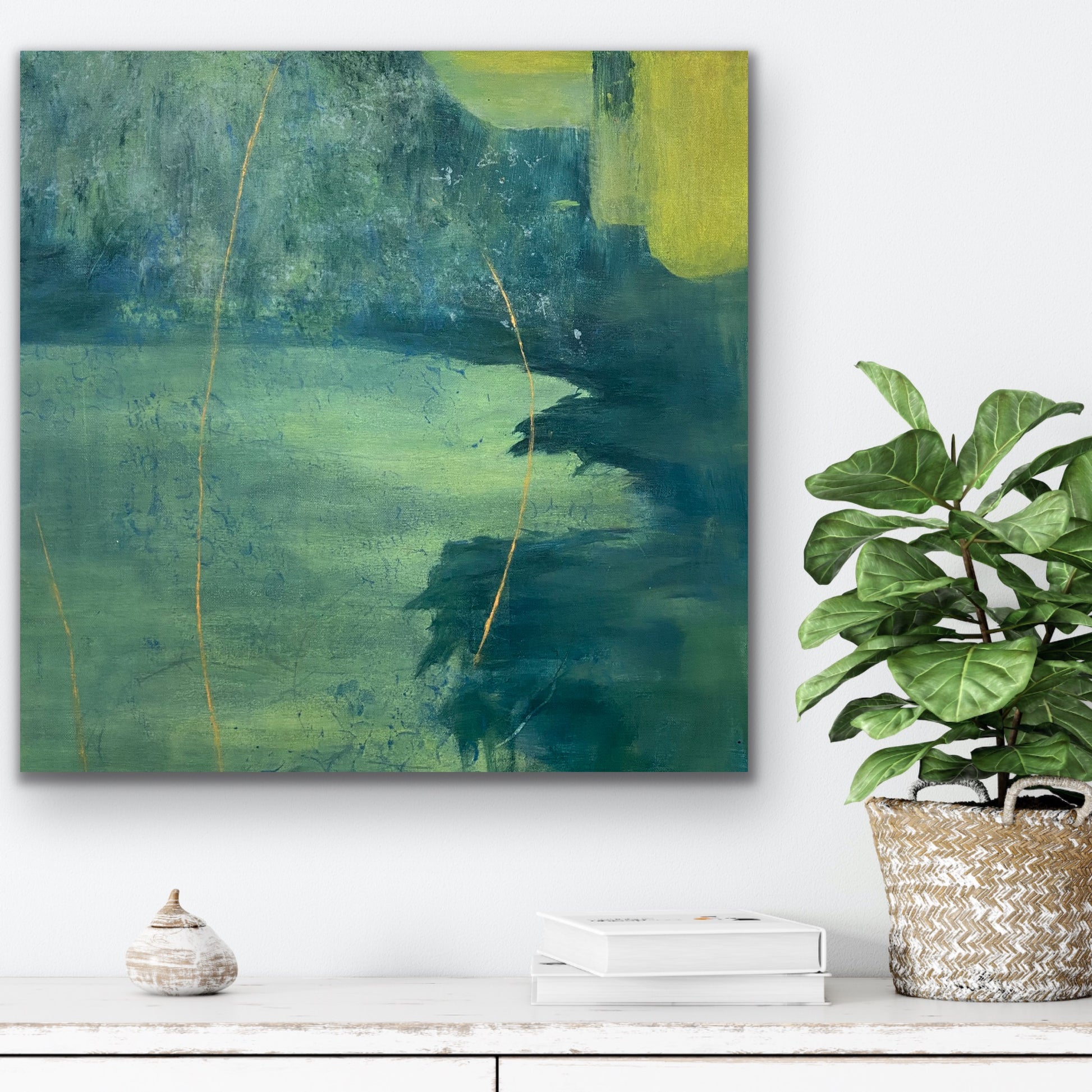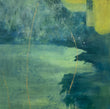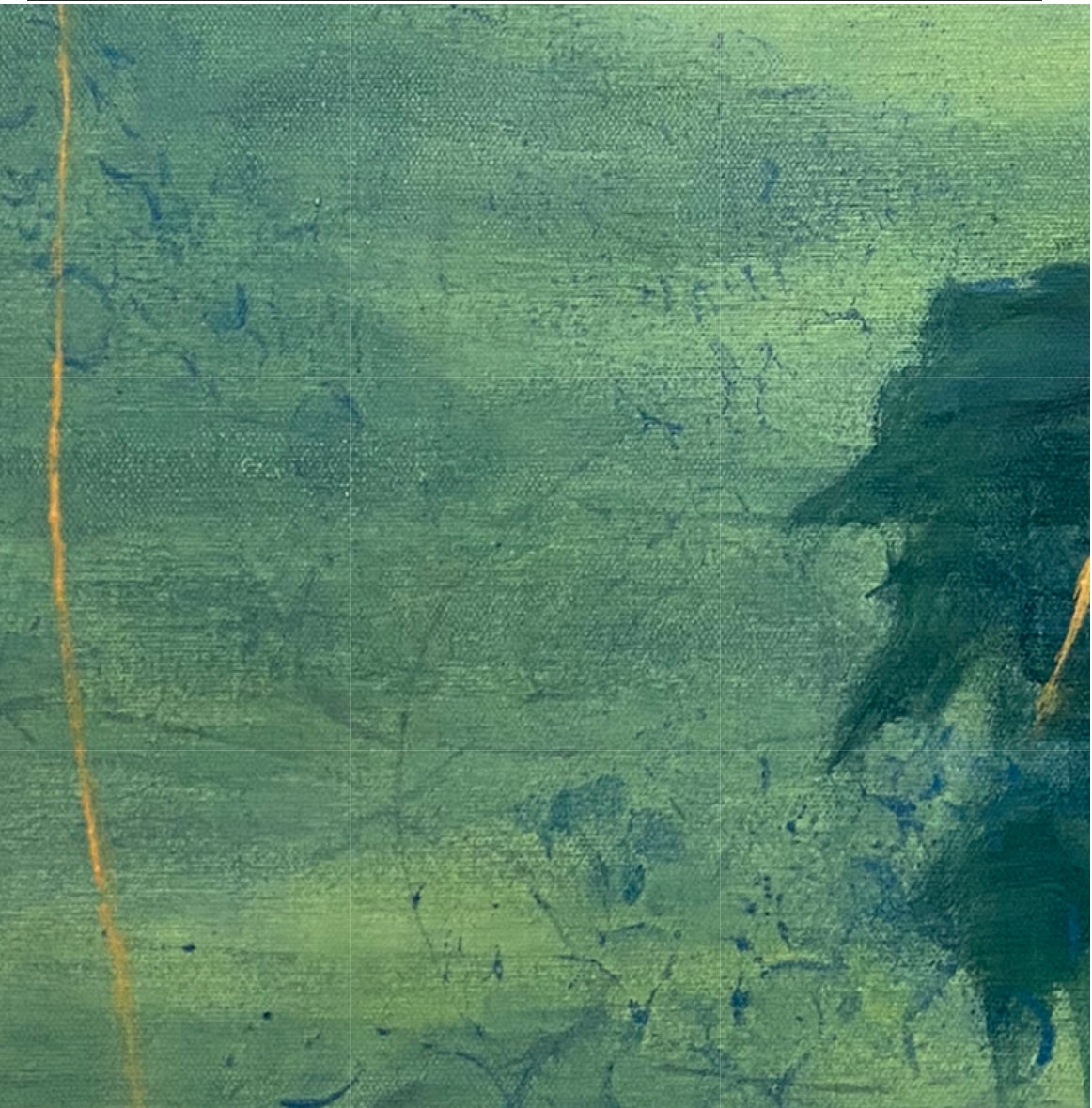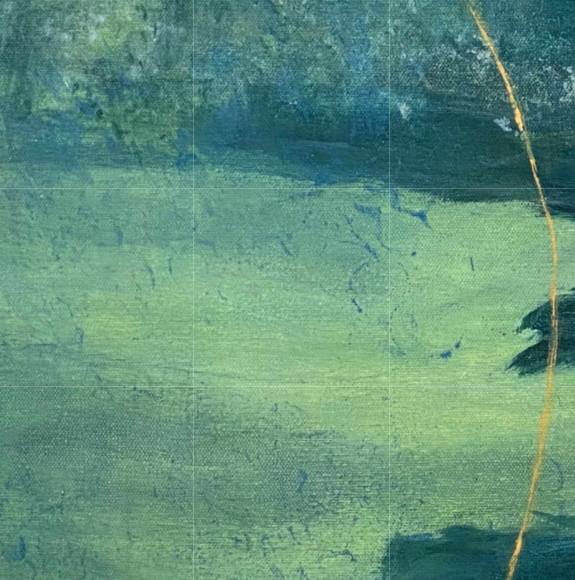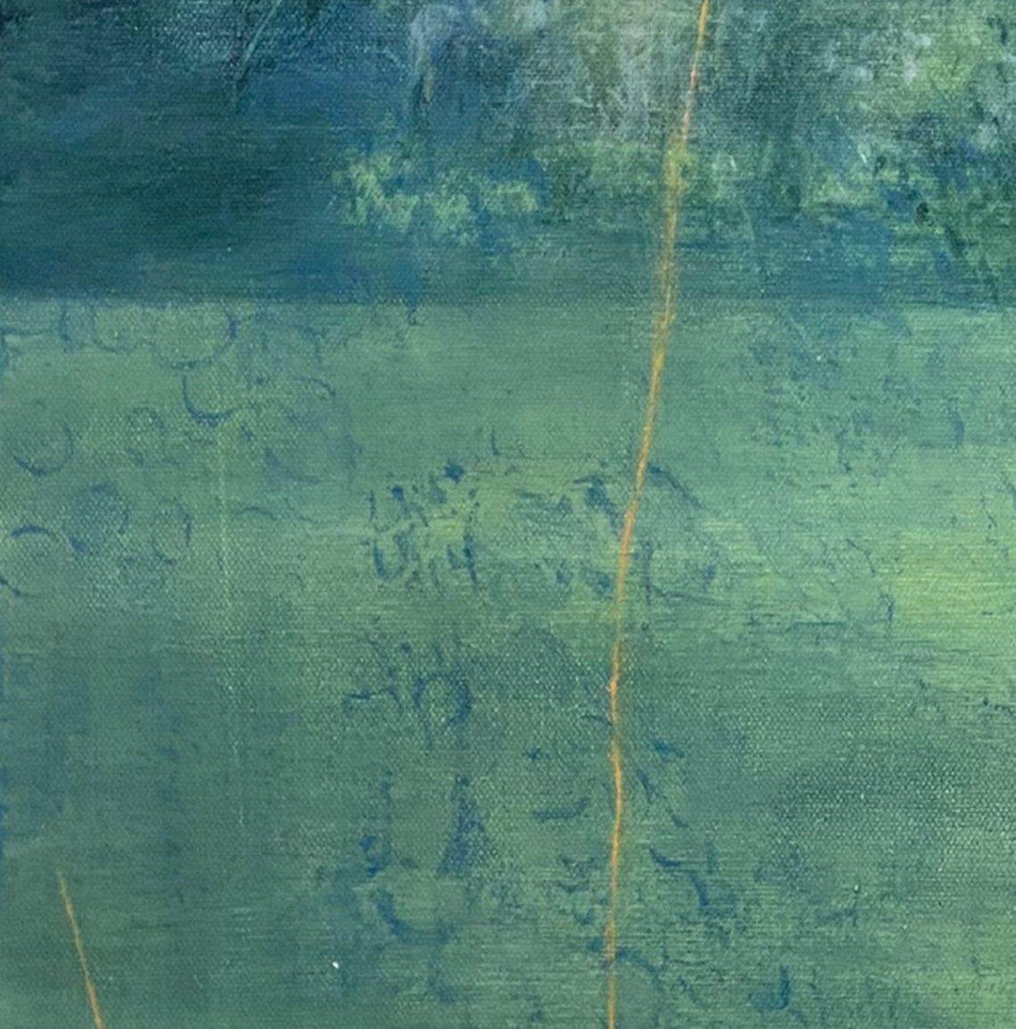 From age ten I was in the school band. In high school, we went to band camp a week before school started so we could prepare for marching season. When I made this painting I thought of it as a body of water surrounded by trees. Now I see it more as a field much like the field at Camp Wahsega located in Dahlonega, GA.