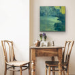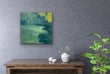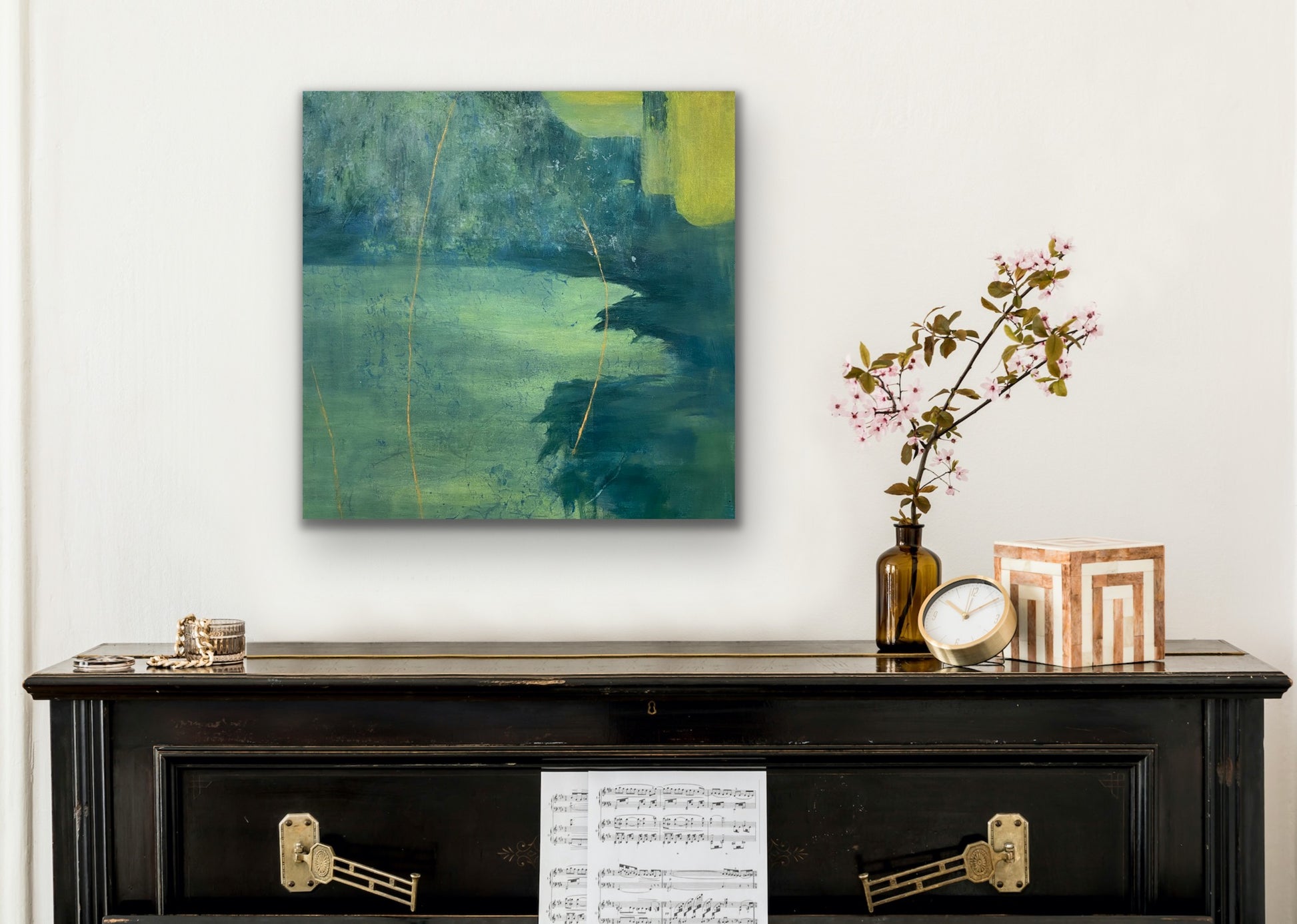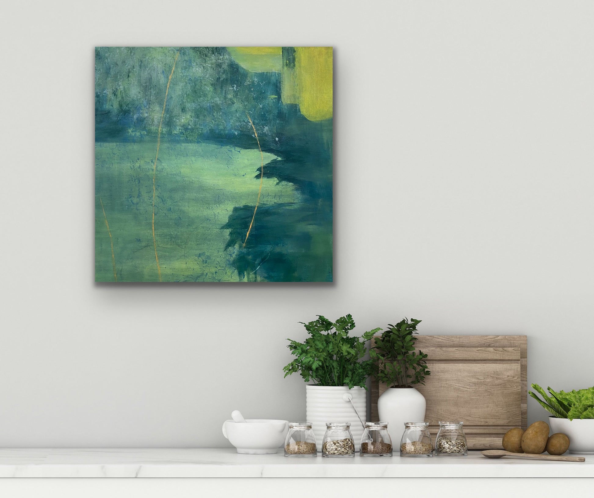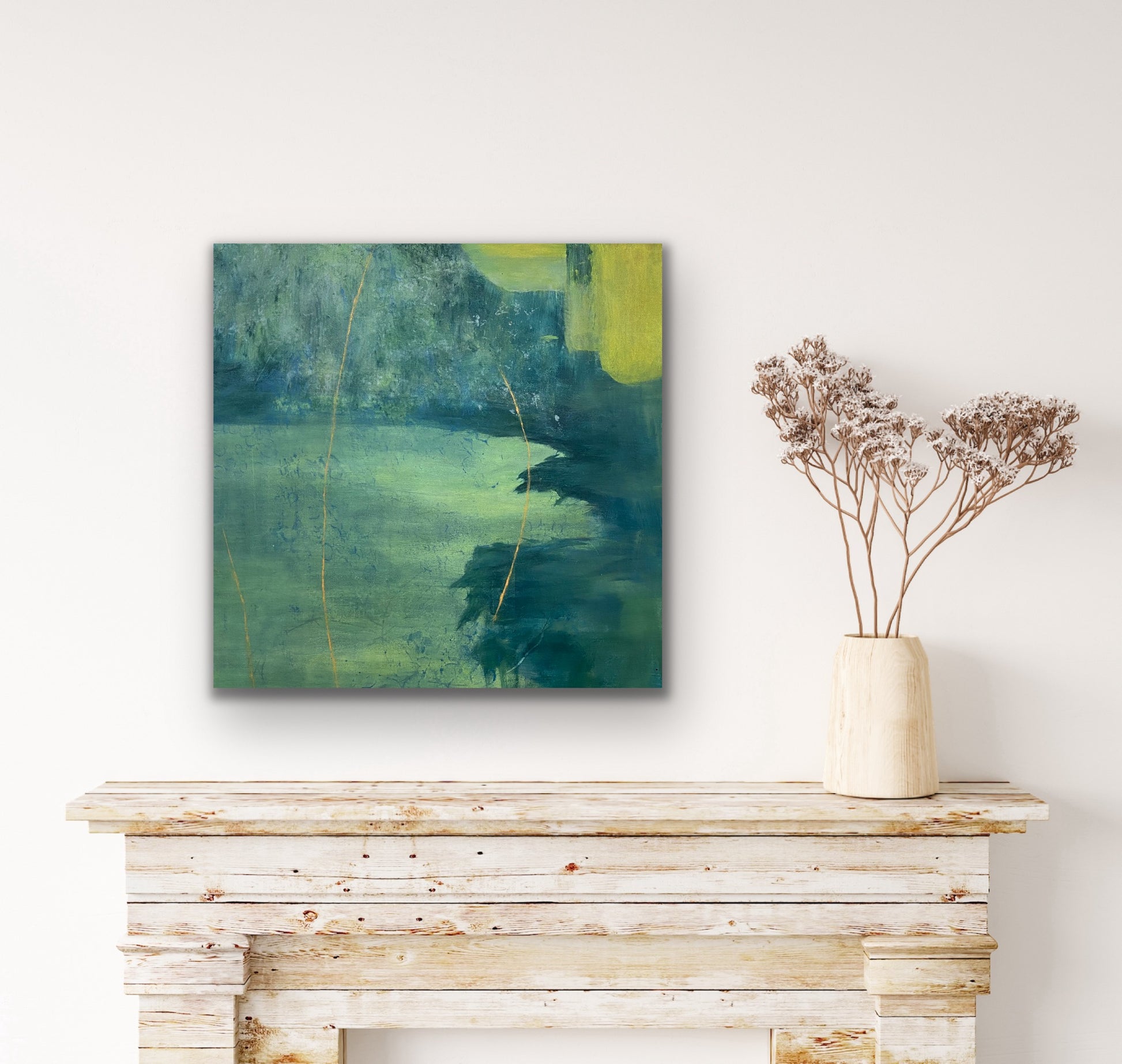 From age ten I was in the school band. In high school, we went to band camp a week before school started so we could prepare for marching season. When I made this painting I thought of it as a body of water surrounded by trees. Now I see it more as a field much like the field at Camp Wahsega located in Dahlonega, GA.