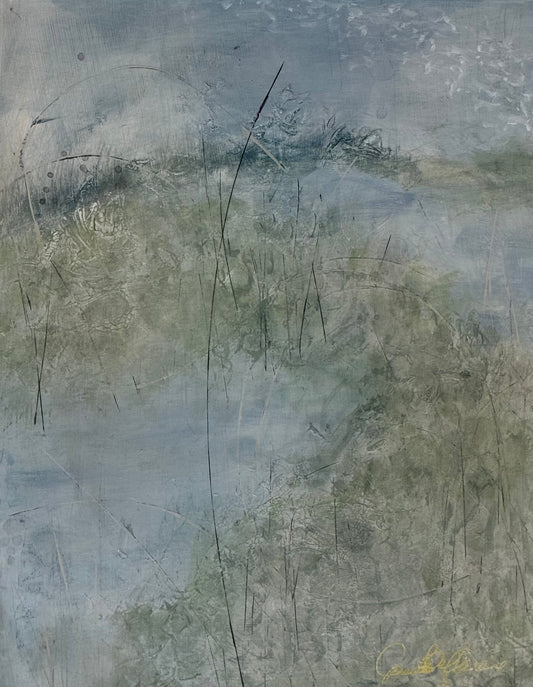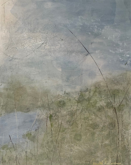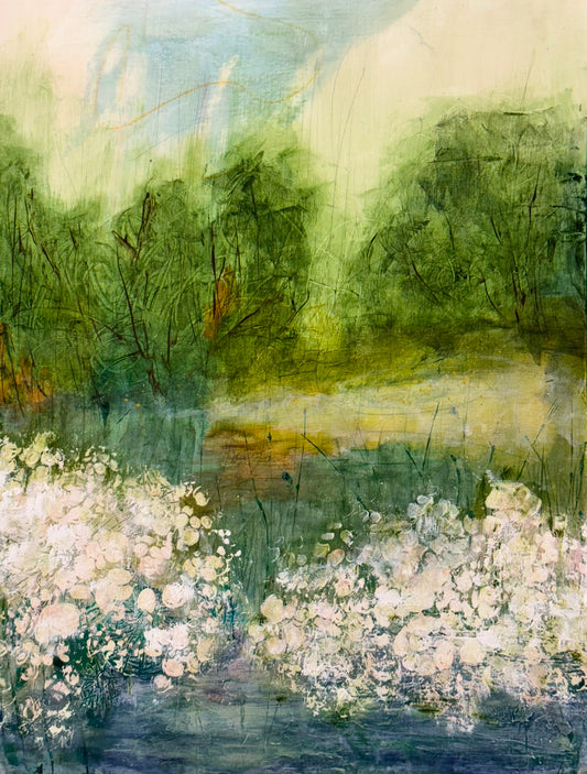 This artwork captures the serene beauty of a riverside landscape, blending soft hues of green,...