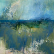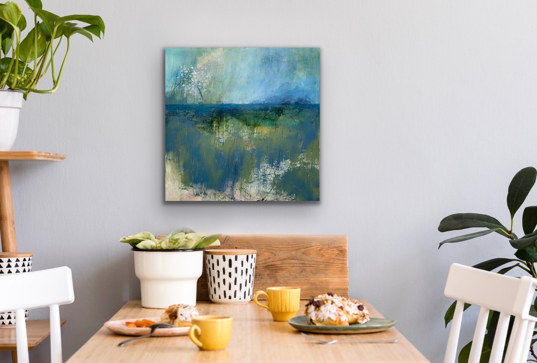 This abstract painting of a marsh-like scene dives deep into the soul. I say that because the vividness of color seems to literally take me across to the distant water and back. The impression of vegetation overlapping sand and other vegetation is mesmerizing.  The interplay of the blues and greens seems to characterize both movement and stillness. The sky adds to the sensory experience where land meets water and breezy ocean air.