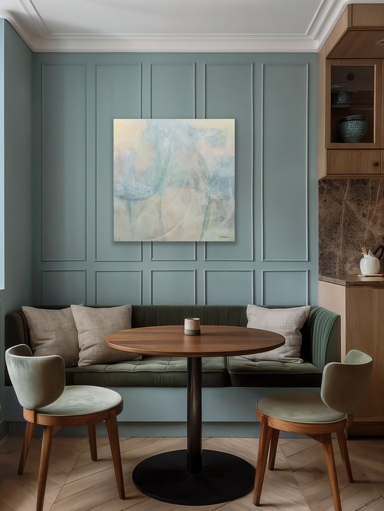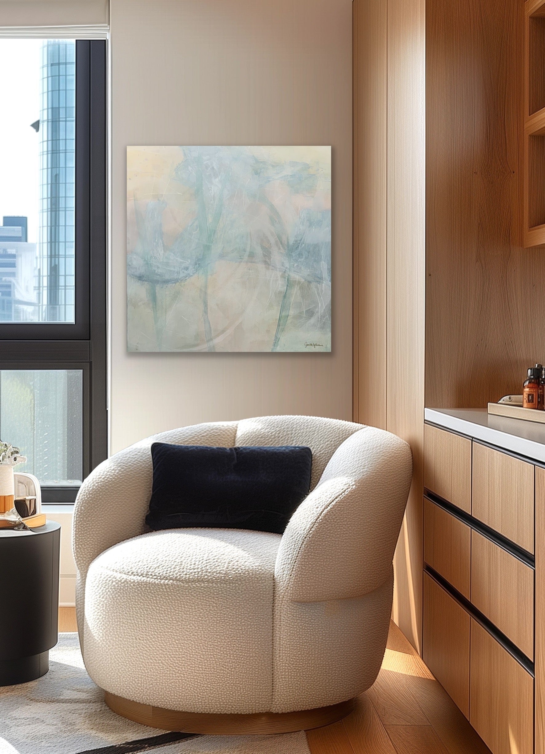 The Atmospheric Balance original painting was created through an intuitive, layered process using acrylic and mixed media. Delicate washes and soft textures establish an atmospheric foundation, while expressive, sweeping lines suggest balance between structure and fluidity. Subtle surface marks add depth and visual interest without overwhelming the composition.