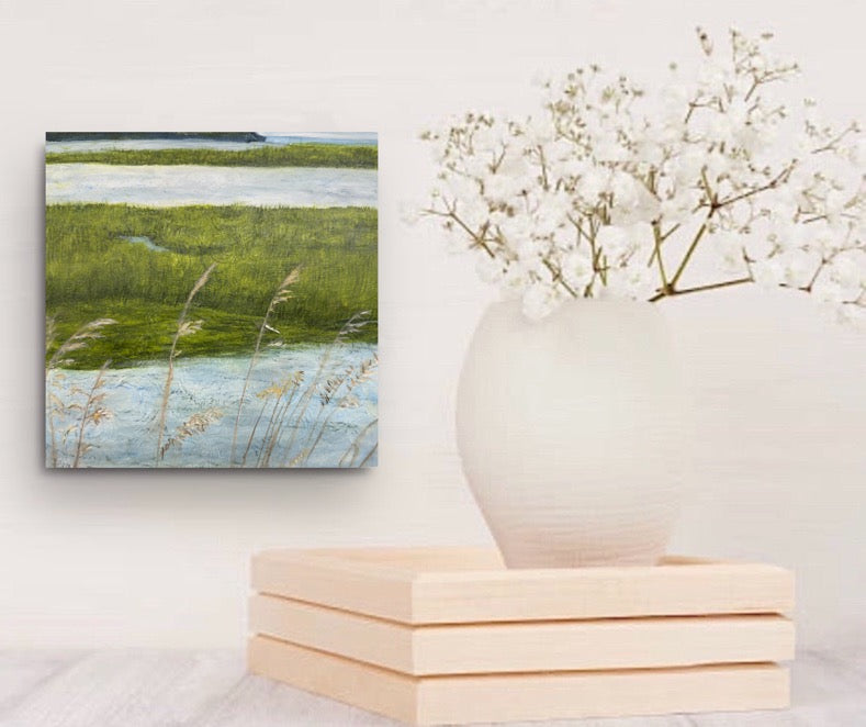 This painting captures the quiet rhythm of a coastal marsh — a landscape where time seems to slow and the air hums with gentle life. Layers of green sweep across the canvas in rich, textural fields, softened by ribbons of water that reflect the sky's pale light. Slender grasses rise in the foreground, their delicate forms catching the whisper of a breeze, bridging earth and sky with effortless grace.