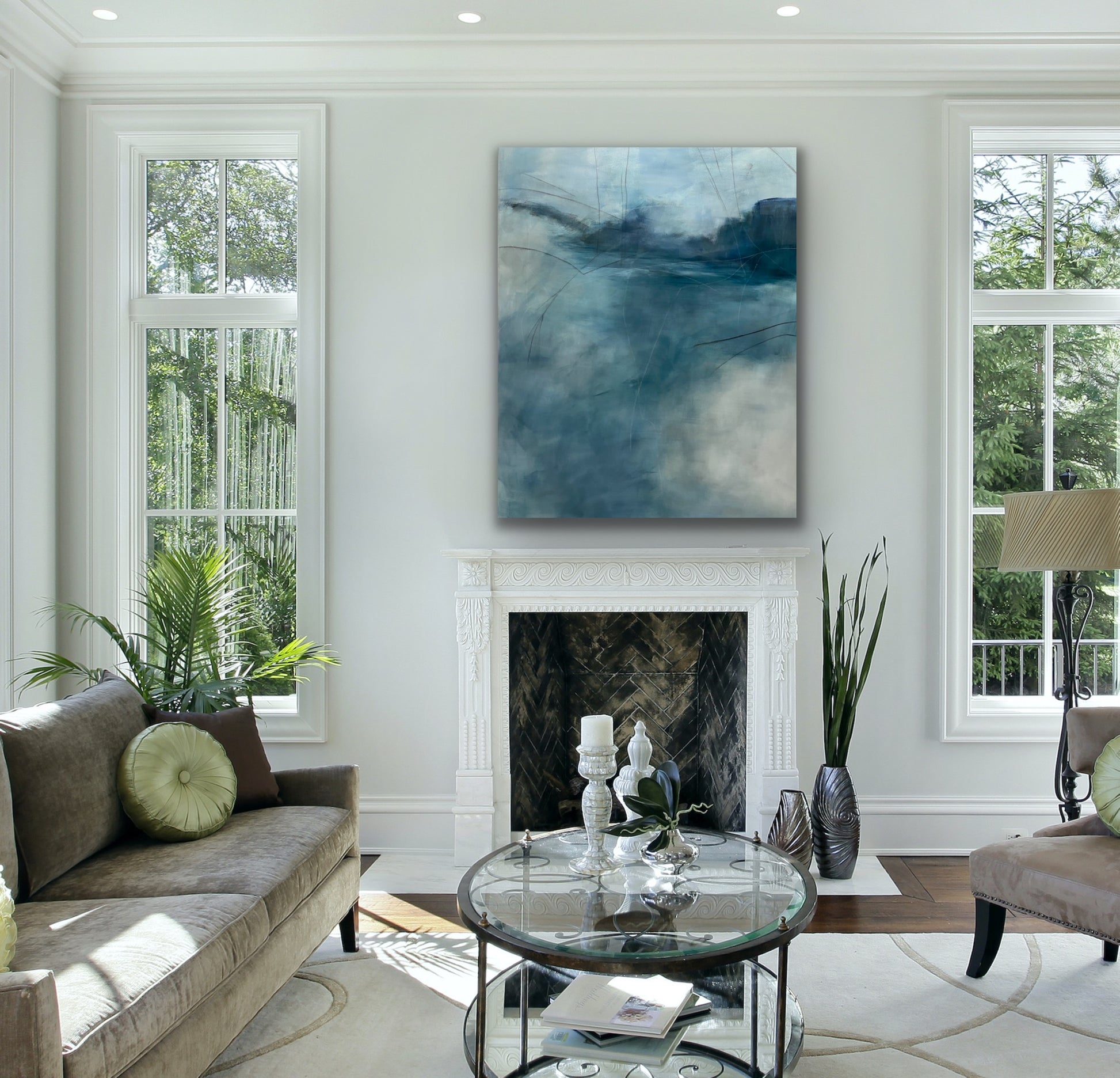 This is not my living room but the sense of peace this painting provides the room is an example of what I strive for in my paintings. Creating moments that give us pause drives me to make paintings. Especially large ones like this.