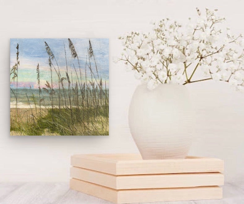 This piece isn’t just a beach scene—it’s a serene invitation. A call to pause, breathe, and return to the places within us that are calm, clear, and open. There’s a sacred hush woven into the layers of paint—one that asks nothing of you but presence.