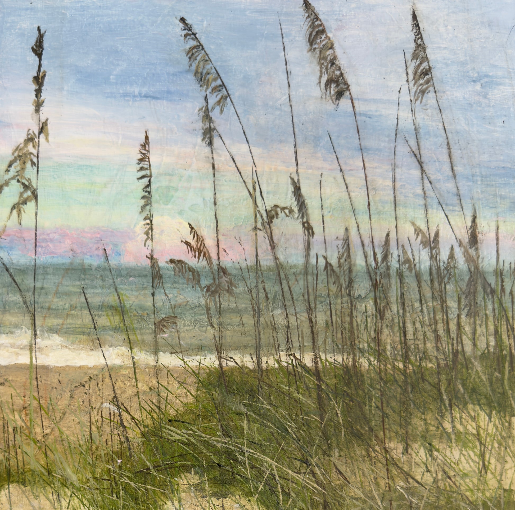Soft whispers of sea oats sway gently across a pastel-lit shoreline, their tall silhouettes etched like quiet sentinels against a glowing sky. The horizon breathes in hues of lavender, seafoam, and rose—colors that feel more like memory than pigment. You can almost hear the hush of the tide in the distance and feel the sand cooling beneath your feet as day slips into dusk.